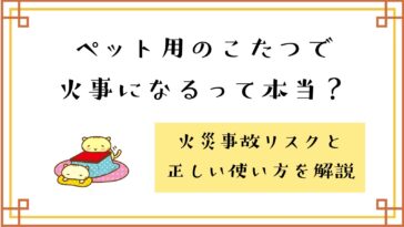 冬 ペット用のこたつで火事になるって本当?火事のリスクと正しい使い方を解説 ペット用のこたつで火事になることはあるのか、について調べてみました。ペット用のこたつで火事が起こる原因と、火事を起こさないための正しい使い方についてお伝えします 2026.01.08 2026.01.09 ペット冬犬猫